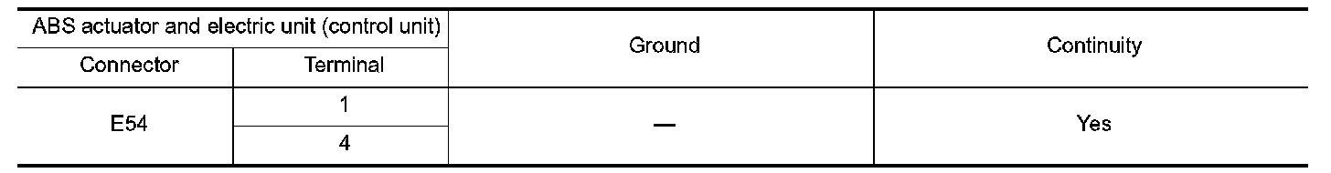 Check continuity between ABS actuator and electric unit (control unit) connector E54 terminal 1, 4 and ground.