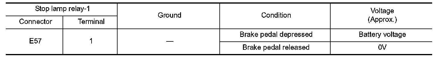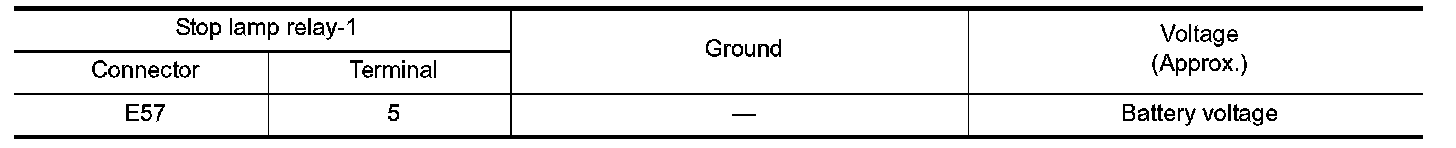 Check voltage between stop lamp relay-1 connector E57 terminal 5 and ground.