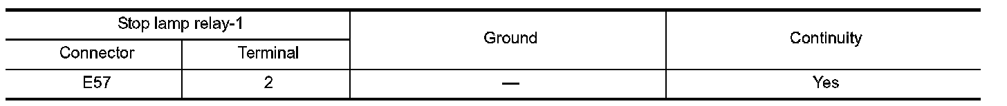 Check continuity between stop lamp relay-1 connector E57 terminal 2 and ground.