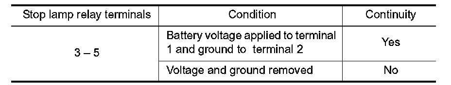 4.Check continuity between stop lamp relay terminals 3 and 5.