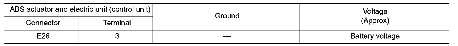 3.Check voltage between ABS actuator and electric unit (control unit) connector E26 terminal 3 and ground.