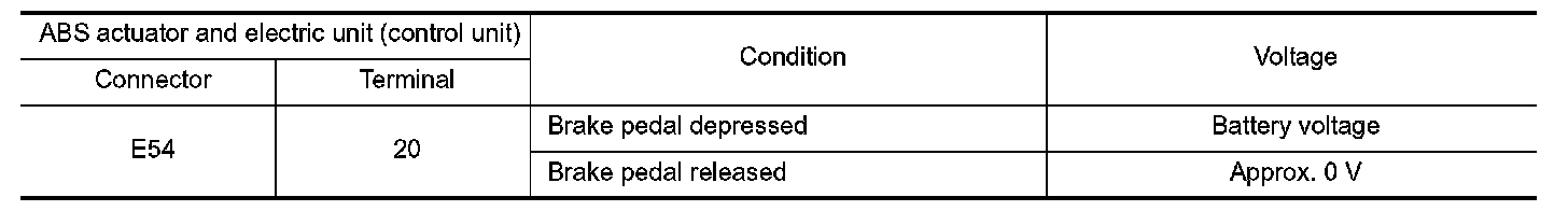 3.Check voltage between ABS actuator and electric unit (control unit) connector E54 terminal 20 and ground.