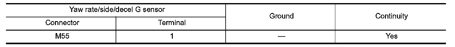 2.Check resistance between yaw rate/side/decel G sensor connector M55 terminal 1 and ground.