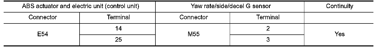 1.Check continuity between ABS actuator and electric unit (control unit) connector E54 and yaw rate/side/ decel G sensor connector M55.