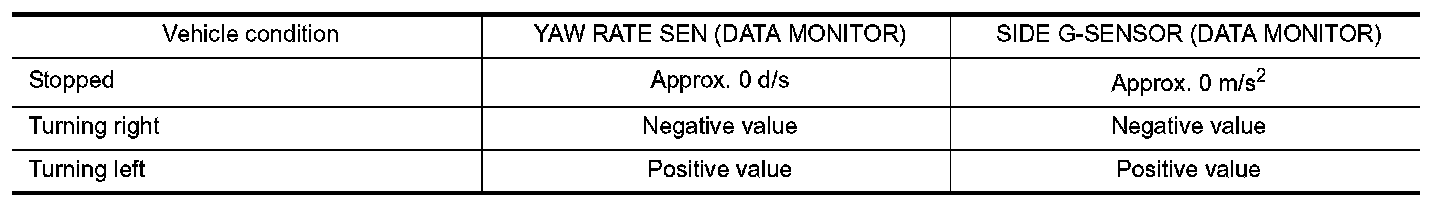 Select "YAW RATE SEN", "SIDE G-SENSOR" in "DATA MONITOR" and check yaw rate/side/decel G sensor signal.