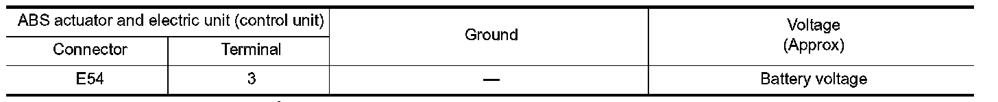 3.Check voltage between ABS actuator and electric unit (control unit) connector E54 terminal 3 and ground.