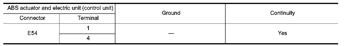 Check continuity between ABS actuator and electric unit (control unit) connector E54 terminal 1, 4 and ground.
