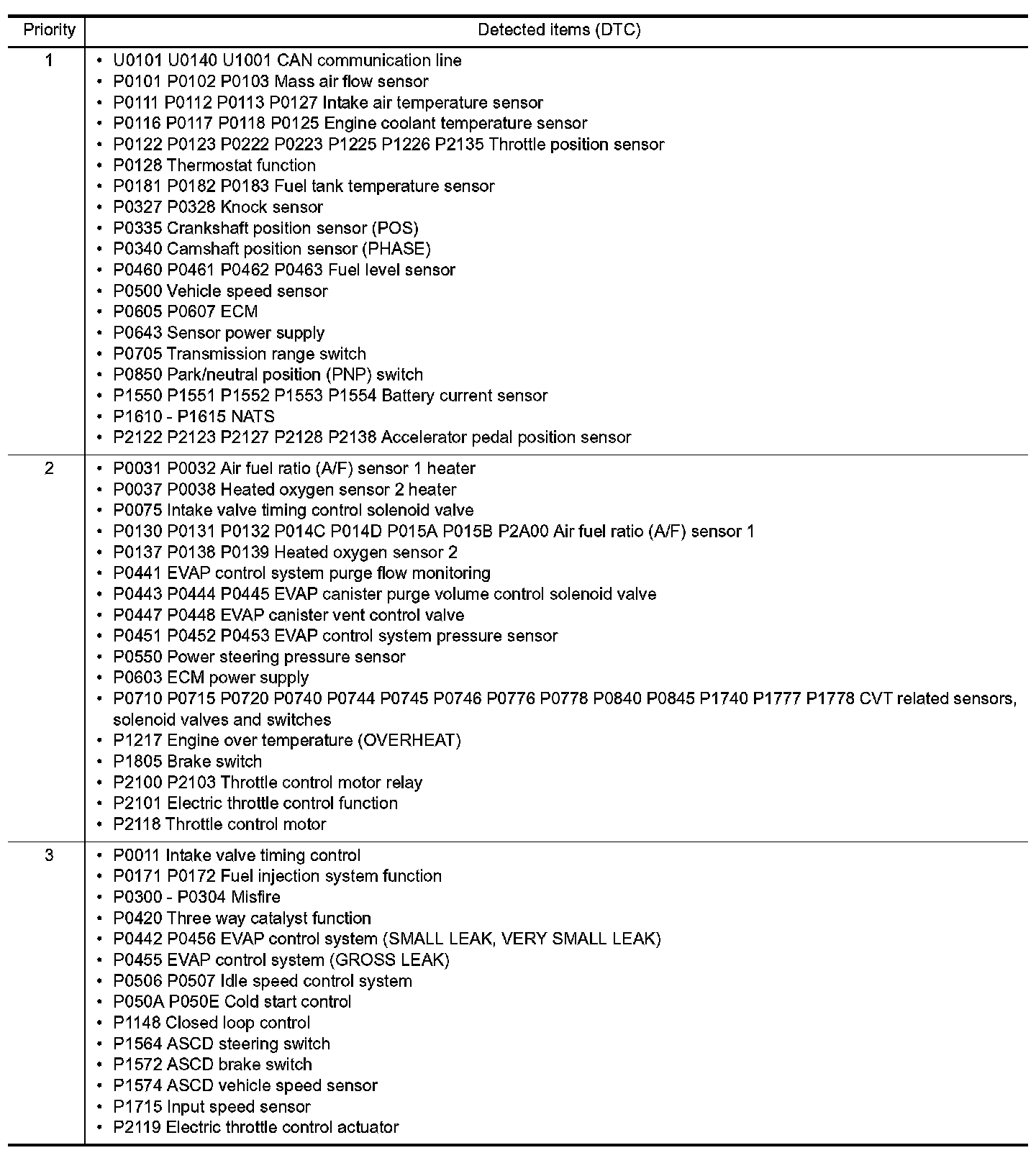 If some DTCs are displayed at the same time, perform inspections one by one based on the following priority chart.