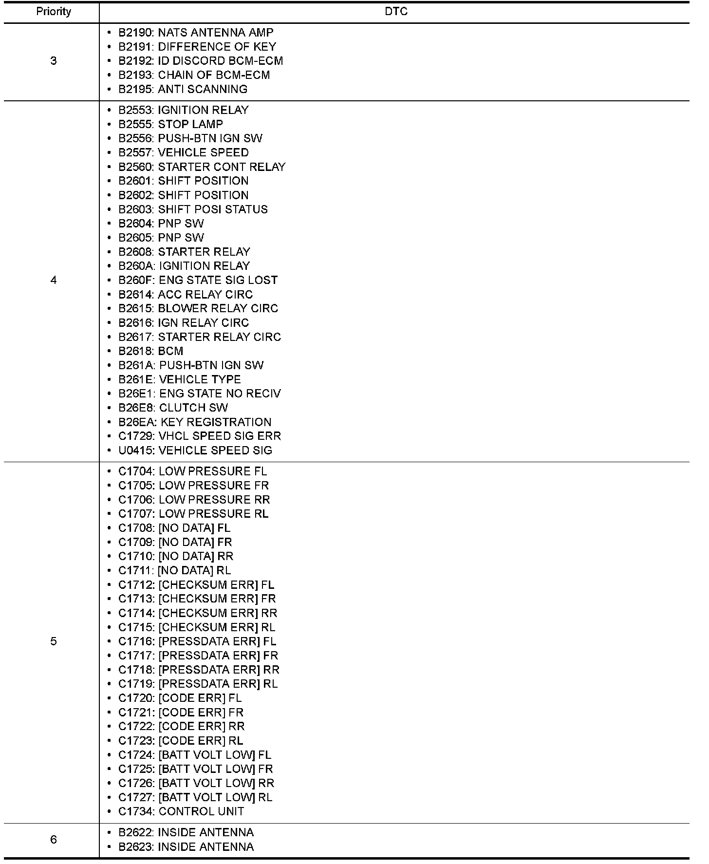 If some DTCs are displayed at the same time, perform inspections one by one based on the following priority chart.