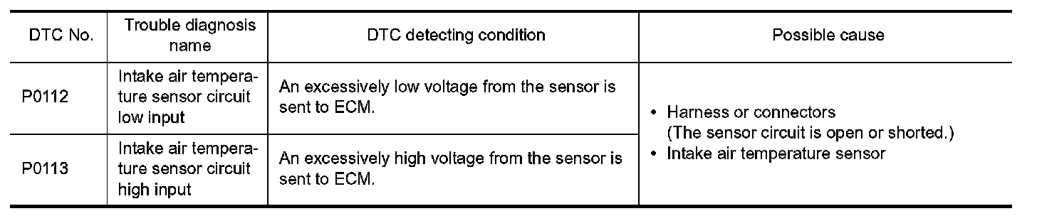 The intake air temperature sensor is built-into mass air flow sensor (1). The sensor detects intake air temperature and transmits a signal to the ECM.
