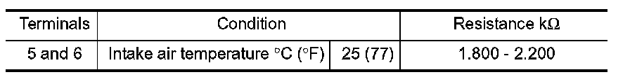 The intake air temperature sensor is built-into mass air flow sensor (1). The sensor detects intake air temperature and transmits a signal to the ECM.