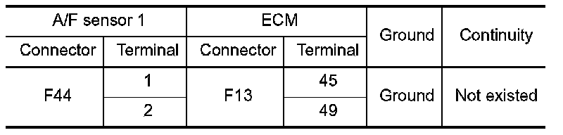 3.Check the continuity between A/F sensor 1 harness connector and ECM harness connector.
