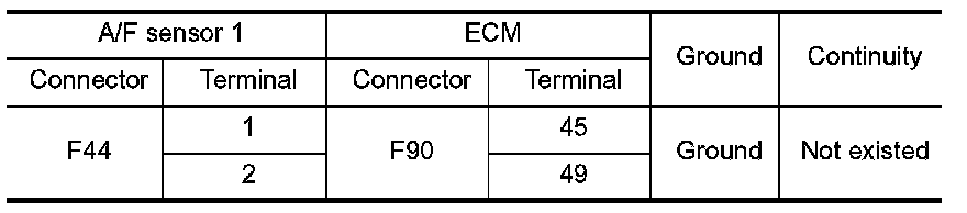 3.Check the continuity between A/F sensor 1 harness connector and ECM harness connector.