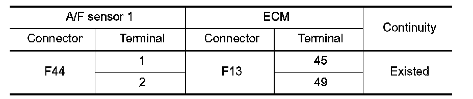 3.Check the continuity between A/F sensor 1 harness connector and ECM harness connector.