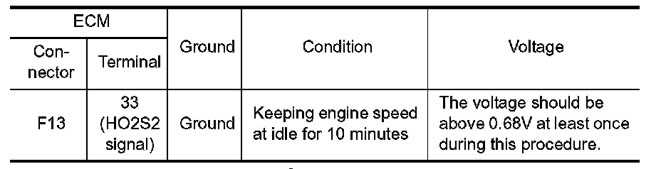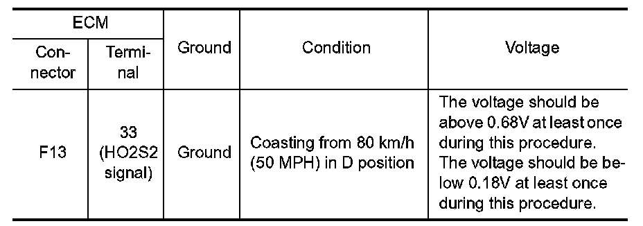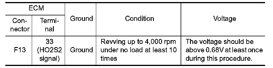 The heated oxygen sensor 2 has a much longer switching time between rich and lean than the air fuel ratio (A/F) sensor 1. The oxygen storage capacity of the three way catalyst (manifold) causes the longer switching time. To judge the malfunctions of heated oxygen sensor 2, ECM monitors whether the maximum voltage of the sensor is sufficiently high during the various driving condition such as fuel cut.