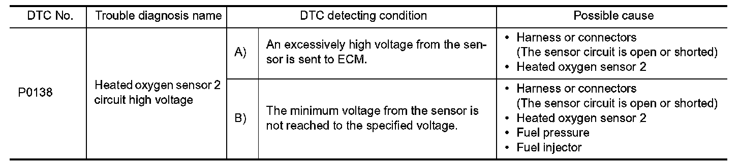 To judge the malfunctions of heated oxygen sensor 2, ECM monitors whether the voltage is unusually high during the various driving condition such as fuel-cut.