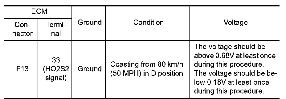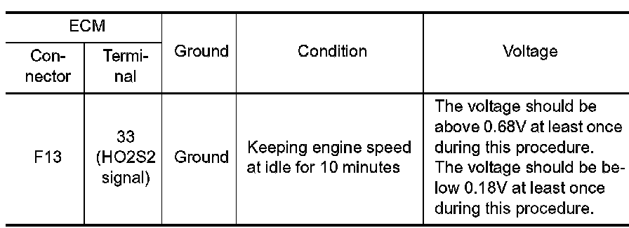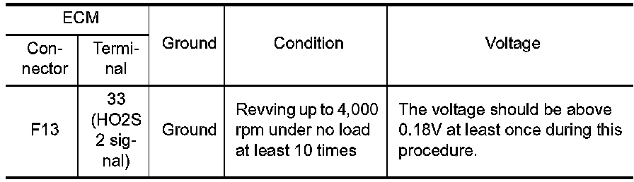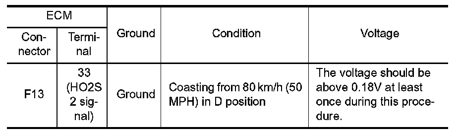 To judge the malfunctions of heated oxygen sensor 2, ECM monitors whether the minimum voltage of sensor is sufficiently low during the various driving condition such as fuel-cut.