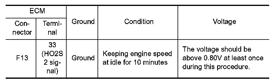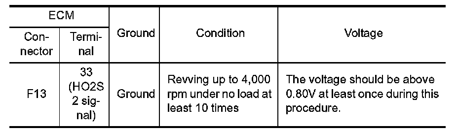 The heated oxygen sensor 2 has a much longer switching time between rich and lean than the air fuel ratio (A/F) sensor 1. The oxygen storage capacity of the three way catalyst (manifold) causes the longer switching time. To judge the malfunctions of heated oxygen sensor 2, ECM monitors whether the switching response of the sensor's voltage is faster than specified during the various driving condition such as fuel-cut.