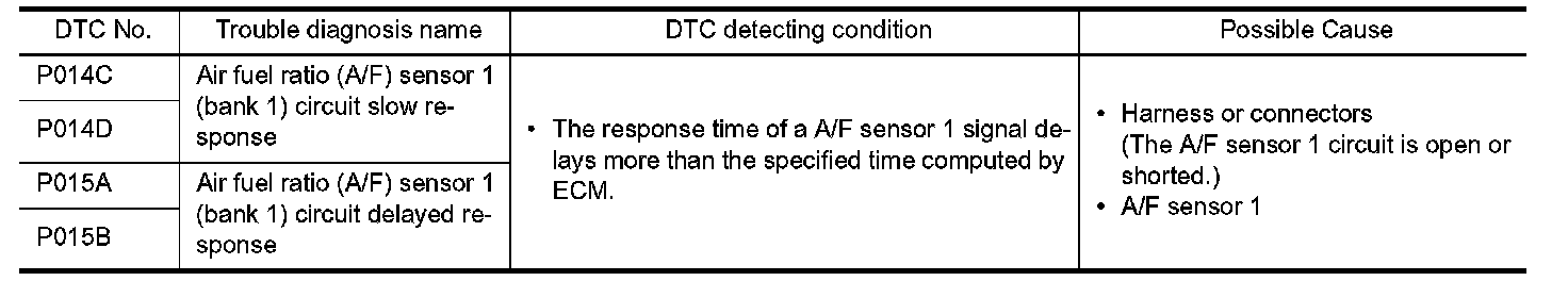 To judge malfunctions, this diagnosis measures response time of the A/F signal computed by ECM from the A/F sensor 1 signal. The time is compensated by engine operating (speed and load), fuel feedback control constant, and the A/F sensor 1 temperature index. Judgment is based on whether the compensated time (the A/F signal cycling time index) is inordinately long or not.
