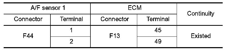3.Check the continuity between A/F sensor 1 harness connector and ECM harness connector.