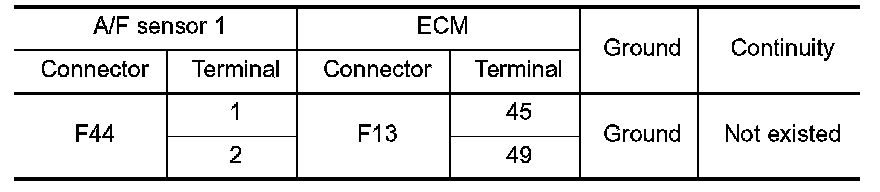 4.Check the continuity between A/F sensor 1 harness connector or ECM harness connector and ground.
