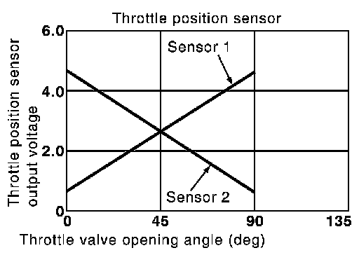 The throttle position sensor has two sensors. These sensors are a kind of potentiometers which transform the throttle valve position into output voltage, and emit the voltage signal to the ECM. In addition, these sensors detect the opening and closing speed of the throttle valve and feed the voltage signals to the ECM. The ECM judges the current opening angle of the throttle valve from these signals and the ECM controls the throttle control motor to make the throttle valve opening angle properly in response to driving condition.