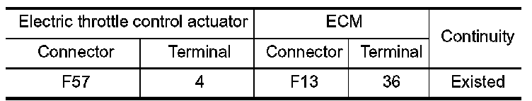 1.Check the continuity between electric throttle control actuator harness connector and ECM harness connector.