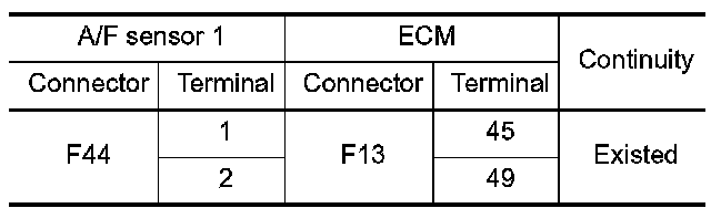4.Check the continuity between A/F sensor 1 harness connector and ECM harness connector.