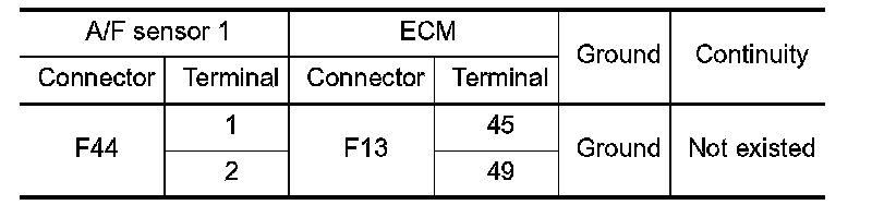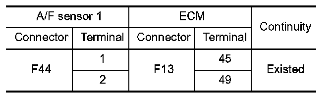 4.Check the continuity between A/F sensor 1 harness connector and ECM harness connector.