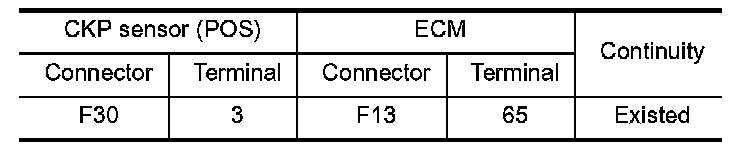 3.Check the continuity between CKP sensor (POS) harness connector and ECM harness connector.