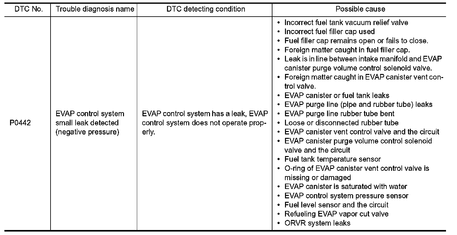 If DTC P0442 is displayed with DTC P0456, first perform the trouble diagnosis for DTC P0456. Refer to