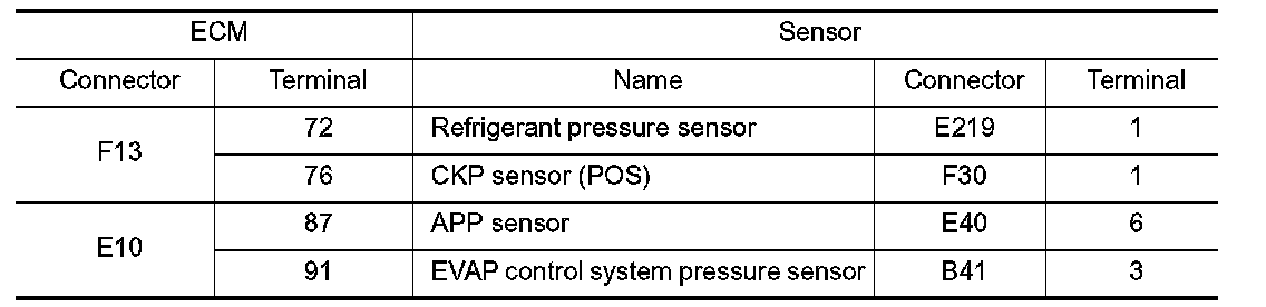 4.Turn ignition switch ON and check output voltage between ECM harness connector and ground under the following conditions.