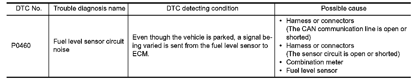 - If DTC P0460 is displayed with DTC UXXXX, first perform the trouble diagnosis for DTC UXXXX.