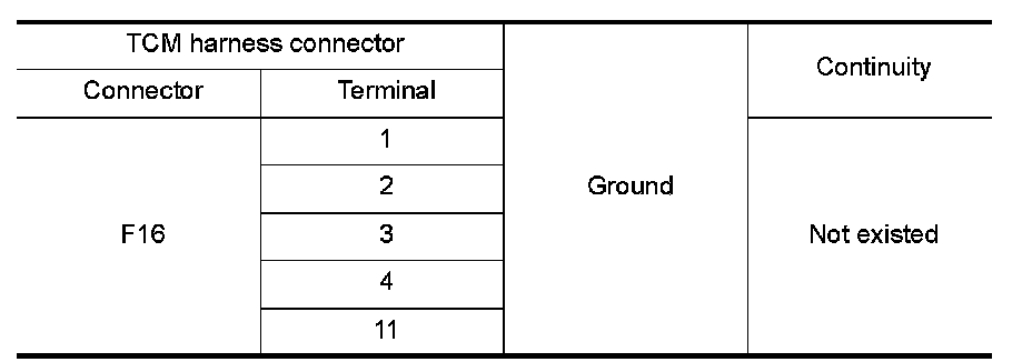 Check continuity between TCM harness connector F16 terminal 1, 2, 3, 4, 11 and ground.