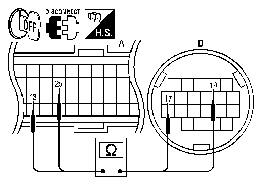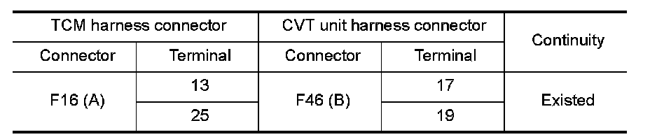 2.Check continuity between TCM harness connector F16 (A) terminal 13, 25 and CVT unit harness connector F46 (B) terminal