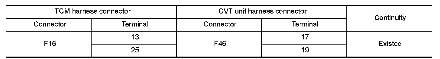 2.Check continuity between TCM harness connector terminals and CVT unit harness connector terminals.