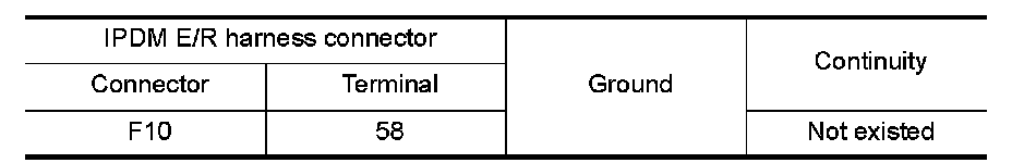 Check continuity between IPDM E/R harness connector F10 terminal 58 and ground.