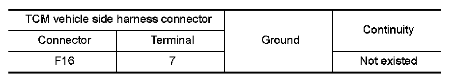 Check continuity between TCM harness connector F16 terminal 7 and ground.