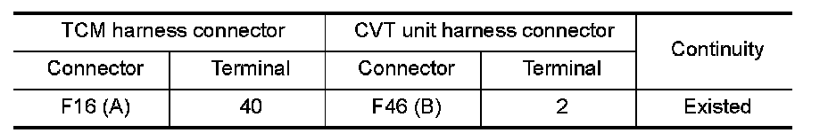 2.Check continuity between TCM harness connector F16 (A) terminal 40 and CVT unit harness connector F46 (B) terminal 2.