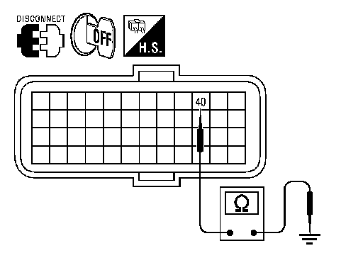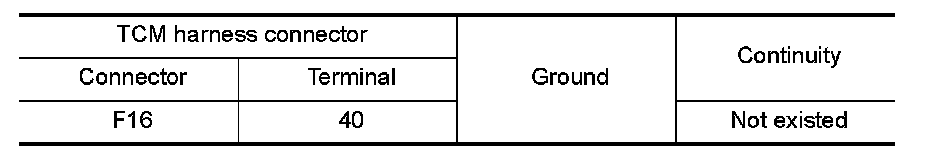 Check continuity between TCM vehicle side harness connector F16 terminal 40 and ground.