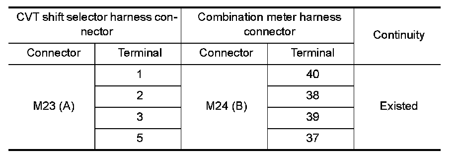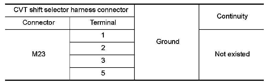 Check continuity between CVT shift selector harness connector M23 terminal 1, 2, 3, and 5 and ground.