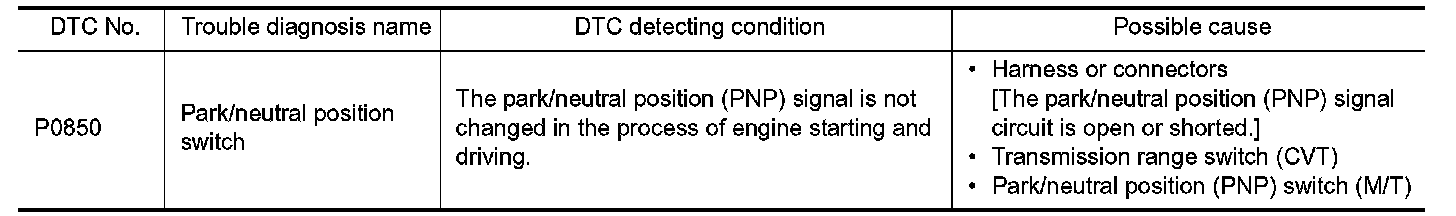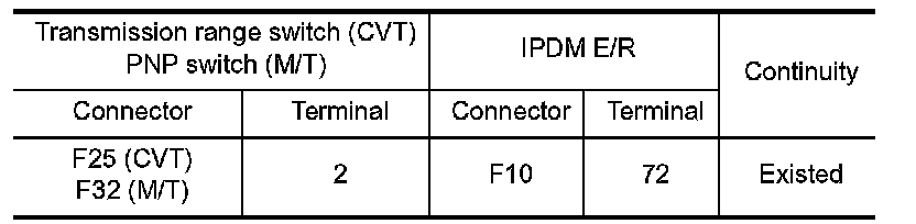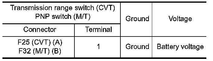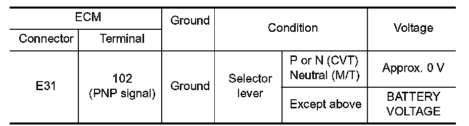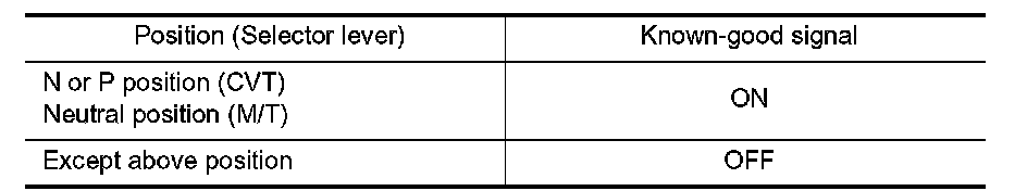 When the selector lever position is P or N (CVT), Neutral position (M/T), transmission range switch (CVT), park/neutral position (PNP) switch (M/T) is ON.