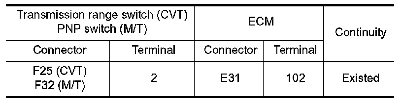 1.Check the continuity between transmission range switch (CVT) or PNP switch (M/T) harness connector and ECM harness connector.