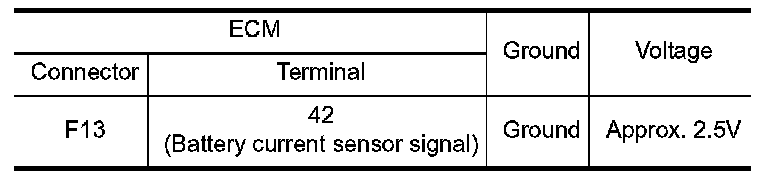 The power generation voltage variable control enables fuel consumption to be decreased by reducing the engine load which is caused by the power generation of the generator. The battery current sensor is installed to the battery cable at the negative terminal. The sensor measures the charging/discharging current of the battery. Based on the sensor signal, ECM judges whether or not the power generation voltage variable control is performed. When performing the power generation voltage variable control, ECM calculates the target power generation voltage based on the sensor signal. And ECM sends the calculated value as the power generation command value to IPDM E/R. For the details of the power generation voltage variable control, System Description.