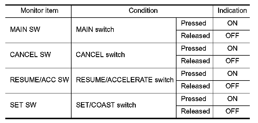 2.Select "MAIN SW", "CANCEL SW", "RESUME/ACC SW" and "SET SW" in "DATA MONITOR" mode with