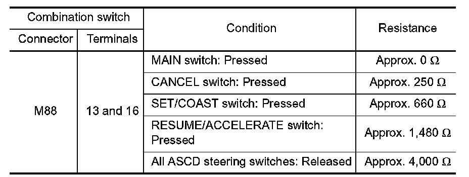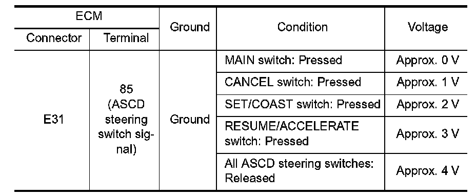 ASCD steering switch has variant values of electrical resistance for each button. ECM reads voltage variation of switch, and determines which button is operated.