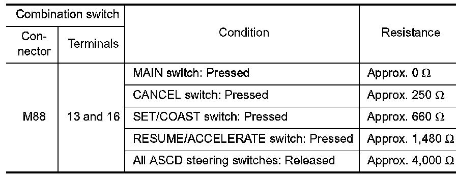 ASCD steering switch has variant values of electrical resistance for each button. ECM reads voltage variation of switch, and determines which button is operated.