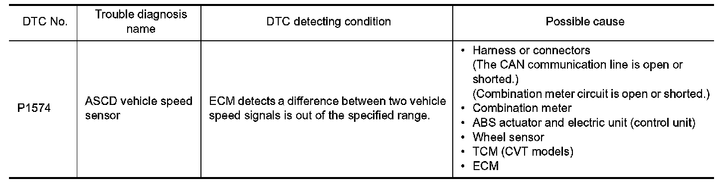 The ECM receives two vehicle speed signals via CAN communication line. One is sent from combination meter, and the other is from TCM (Transmission control module). The ECM uses these signals for ASCD control. System Description for ASCD functions.