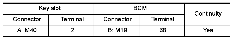 2.Check continuity between key slot harness connector M40 (A) terminal 2 and BCM harness connector M19 (B) terminal 68.