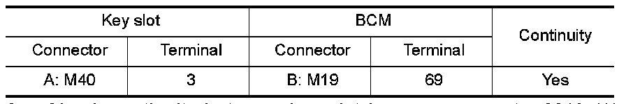 2.Check continuity between key slot harness connector M40 (A) terminal 3 and BCM harness connector M19 (B) terminal 69.